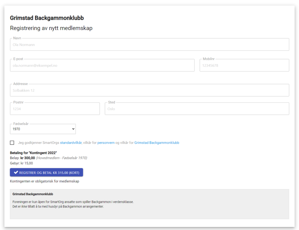 SmartOrg er ikke bare for styret. Medlemmene har også tilgang til sin egen profil og det de trenger å gjøre av påmeldinger, bestillinger og betalinger. Enkelt å ta betalt både med Vipps og kort.